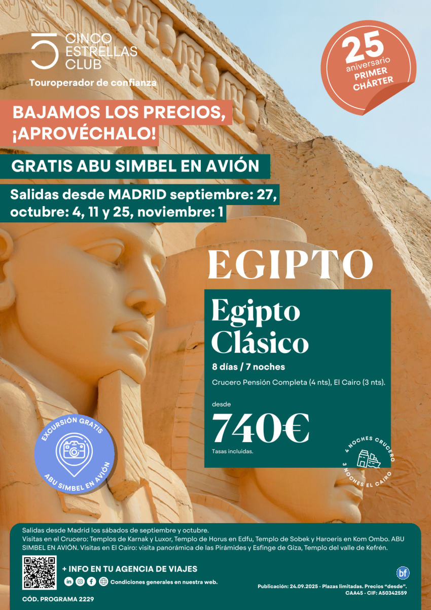 Bajamos Precios! Gratis Abu Simbel en avión dsd 740€ 8d/7n sal: 27 Sep, 04 ,11,25 Oct y 01 de Nov. dsd Madrid