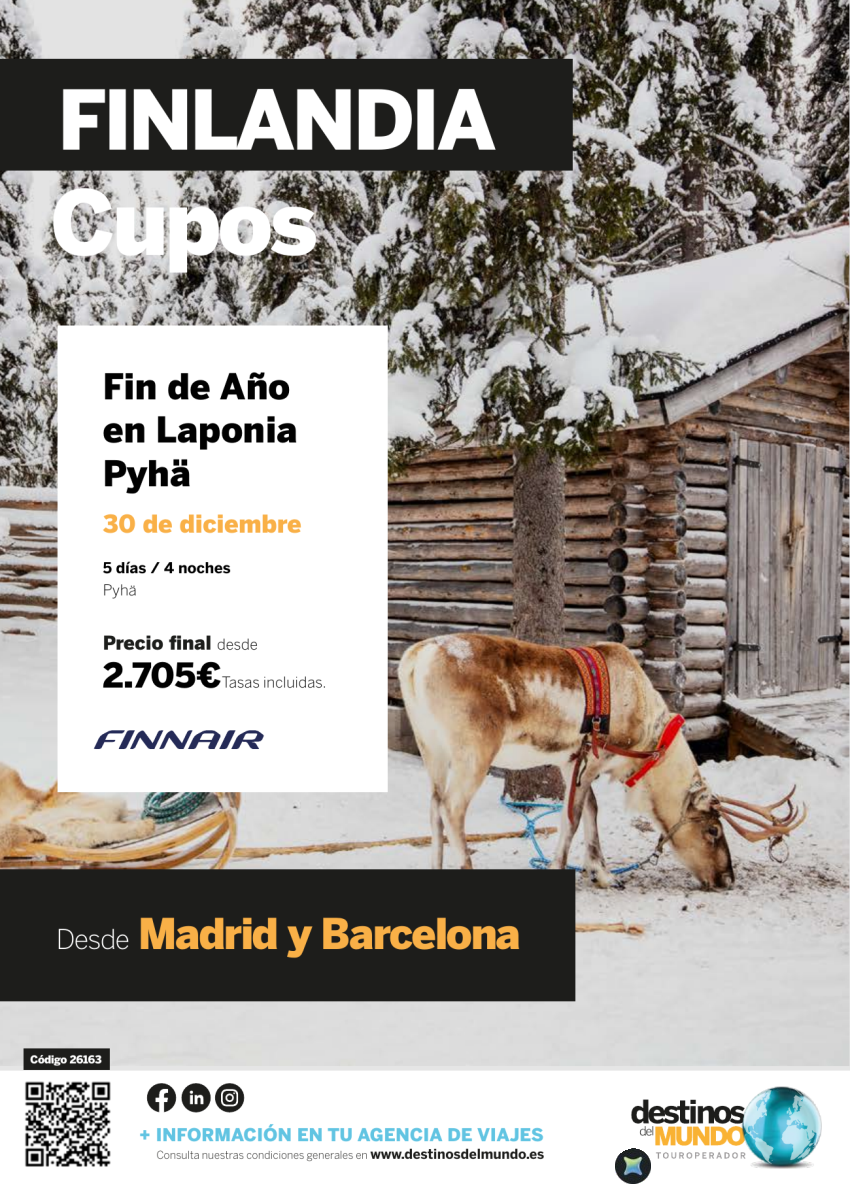 🇫🇮 🥳Fin de Año en Laponia Pyhä origen: Madrid y Barcelona 5 d / 4 n salida: 30 diciembre desde 2.705€ 🇫🇮